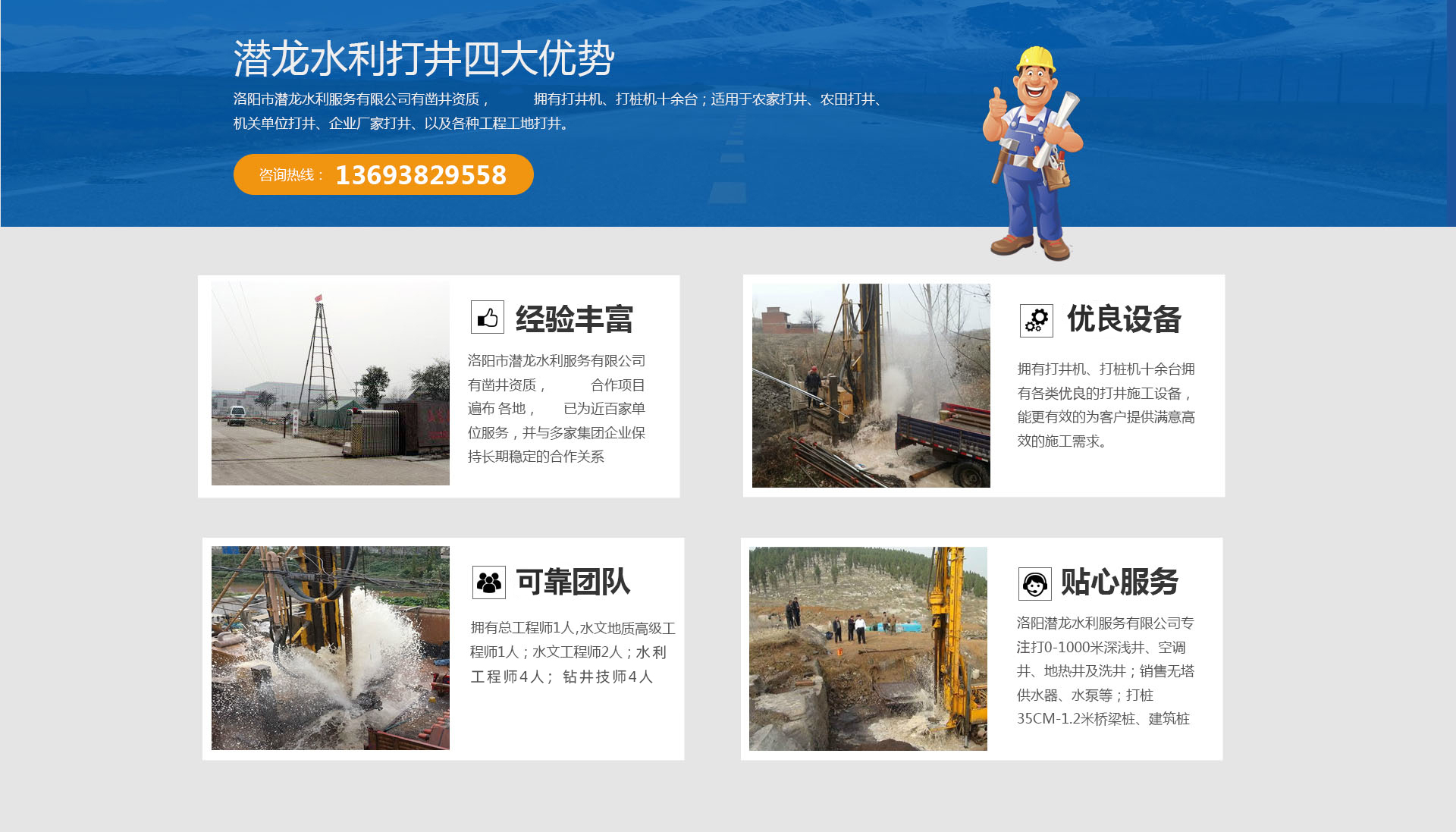 洛陽(yáng)市潛龍水利服務(wù)有限公司擁有總工程師1人;水文地質(zhì)高 級(jí)工程師1人;水文工程師2人;水利工程師4人;鉆井技師4人。公司多年來(lái)為農(nóng)業(yè)水利灌溉和工業(yè)用水做出了很多貢獻(xiàn)。